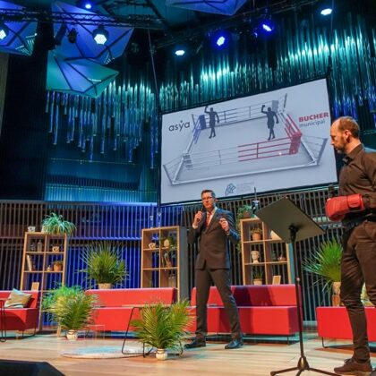 (Mikus Brakanskis, SIA "Bucher Municipal" vadītājs un Ēvalds Urtāns, SIA "Asya" vadītājs | Diskusijas moderators - Salvis Roga, Zaļo un viedo tehnoloģiju klastera valdes priekšsēdētājs)